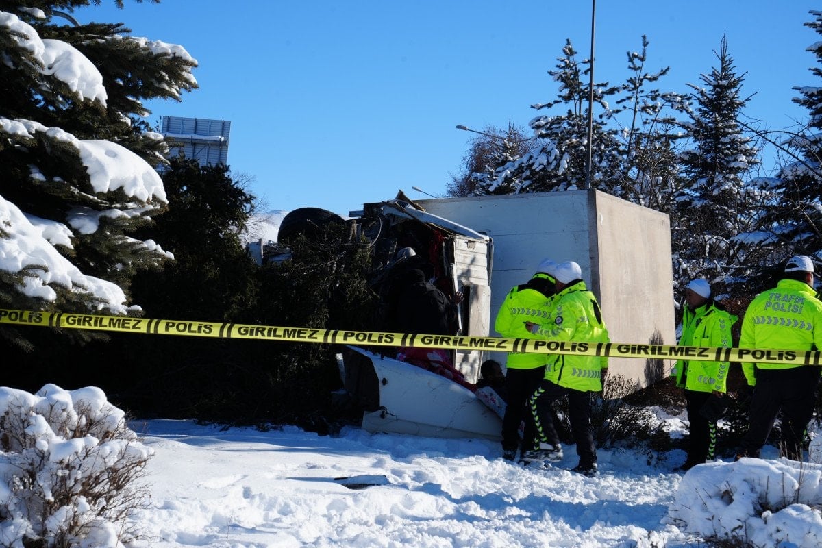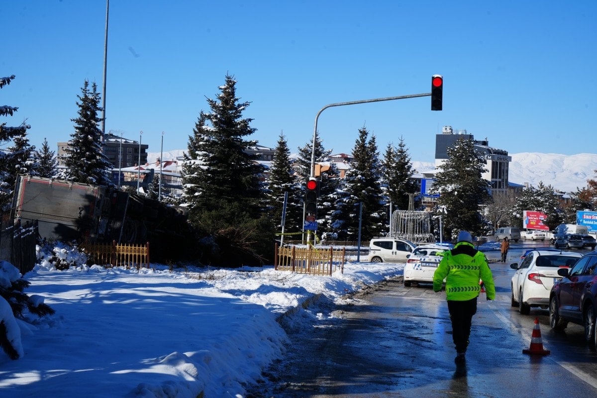 - Erzurum'da bir kamyon, hızını alamayarak refüje çıkıp devrildi.