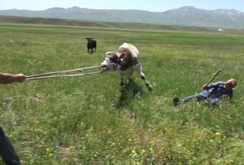 Bağlı olduğu halatlarla kontrol altına alınamayan boğanın üçüncü saldırısı üzerine Karasu, yerde yuvarlanarak kurtuldu.