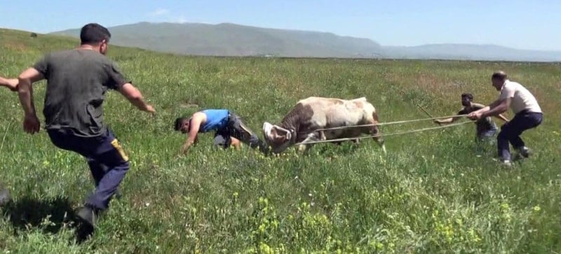 Sabah 08.00'den itibaren peşinden koşuyoruz. Hayvana dokunmadan zıplıyordu, zinciri kırdı, yuları koparıp kaçtı. O saatten beri dağda bayırda peşinden koşturuyoruz. En sonunda dereye sıkıştırdık, boynuna kement attık. Kardeşim kazağını çıkarıp gözünü kapattı. Yolda gelirken önce beni düşürdü, boynuzuyla kolumu morarttı. Biraz ilerledikten sonra kardeşimi de önüne katıp sürdü vurarak. Belediyeye telefon açtık. Kurban yakalama timi geldi yardım etti. 3 tane iğne vurdu. Bir tane de fayda etmedi. O şekilde hayvanı sakinleştirdi.