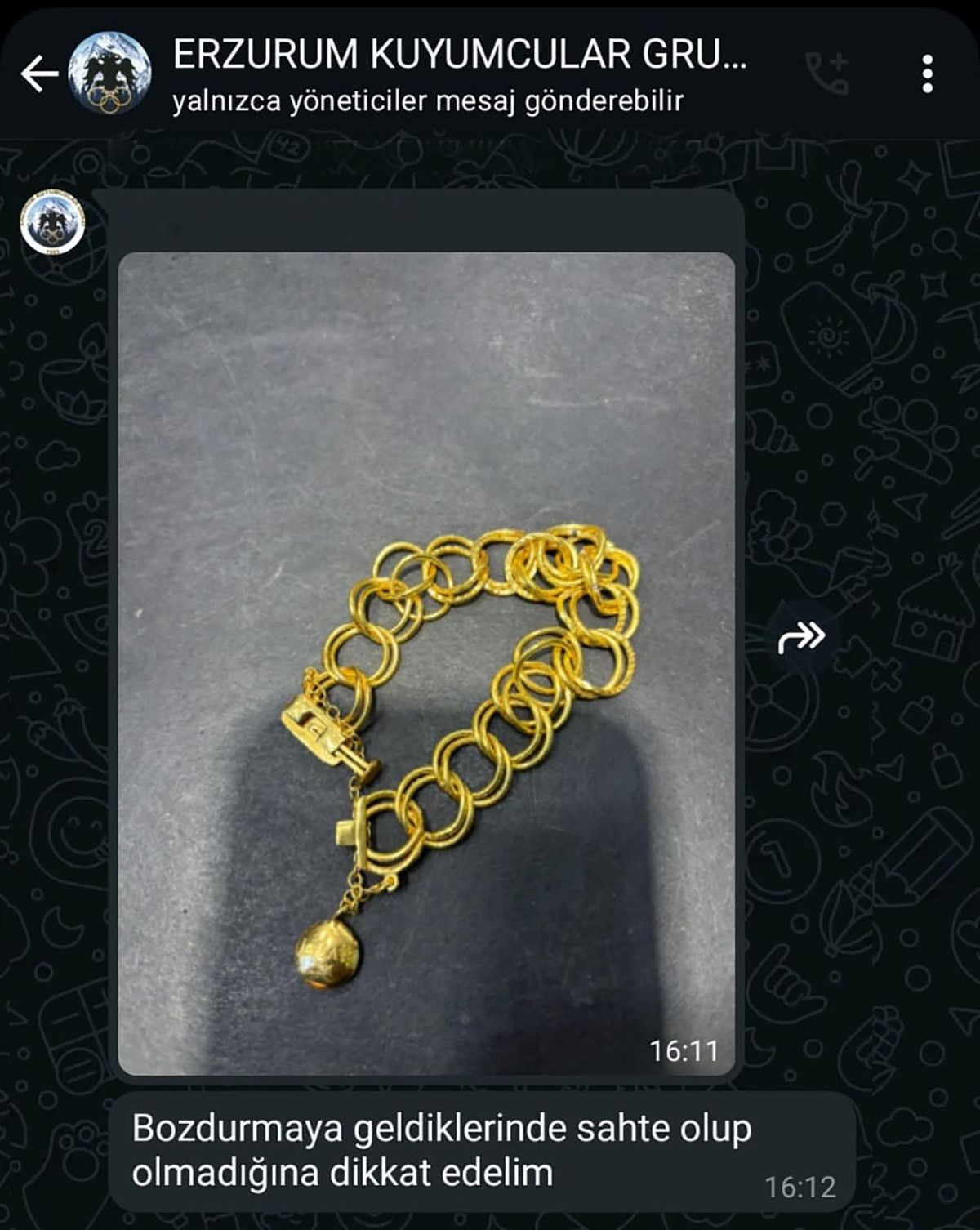 Kuyumcular Derneği'nden gelen uyarı mesajı üzerine bilekliğin sahte olduğunu anlayan Bilici, durumu Kuyumcular Çarşısı'nda görevli polise bildirdi.