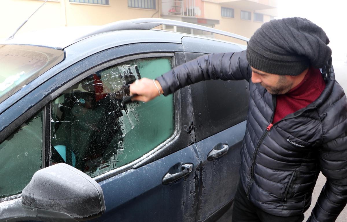 Kentte sabah iş yerine gitmek isteyen araç sahipleri, ellerine kazıyıcı alıp otomobillerinin buz tutan camlarını kazıdı.