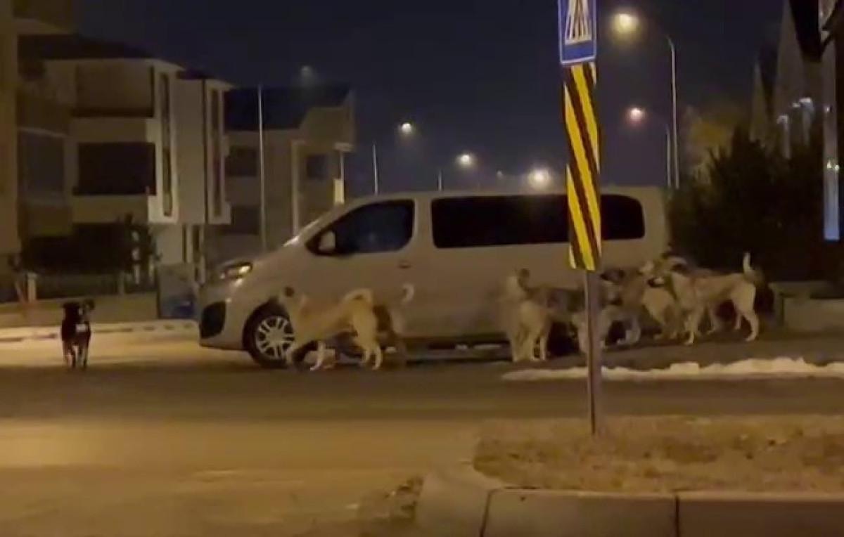 Kentte çekilen fotoğraflarda, 20-25 tane köpeğin cadde üzerinde ilerlediği görüldü.