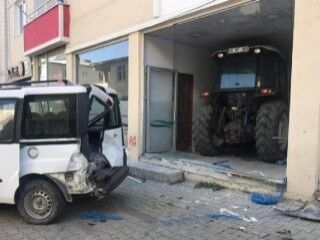 Erzurum'un Horasan ilçesi Recep Tayyip Erdoğan Mahallesi'nde beş katlı apartmanın alt katında bulunan iş yerinden içeri dalan traktör, paniğe neden oldu.