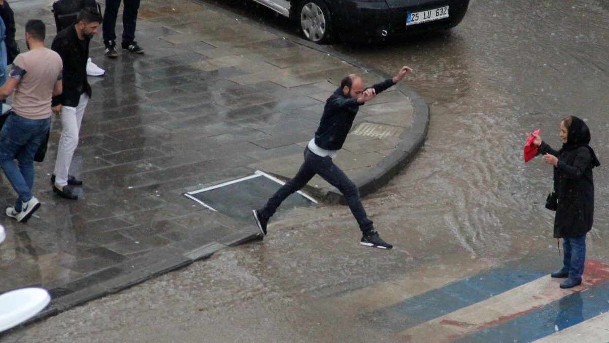 Caddede biriken yağmur sularından kaçmak isteyen vatandaşların akrobatik hareketlerle kaldırımdan atlamaları renkli görüntüler oluşturdu.