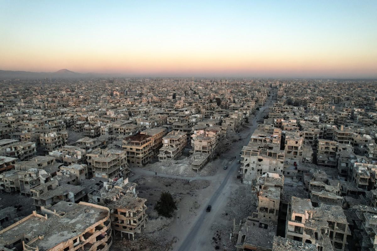 Rejim güçlerinin varil bombalarıyla saldırdığı kampta, tüm binalarda savaşın yıkıcı izleri dikkat çekiyor.