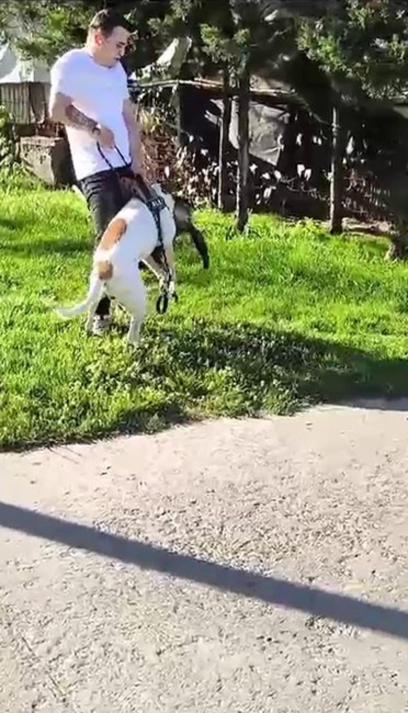 Bir süre sonra pitbull cinsi köpek, kediyi bıraktı ancak bu kez de sahibini ısırmaya çalıştı.