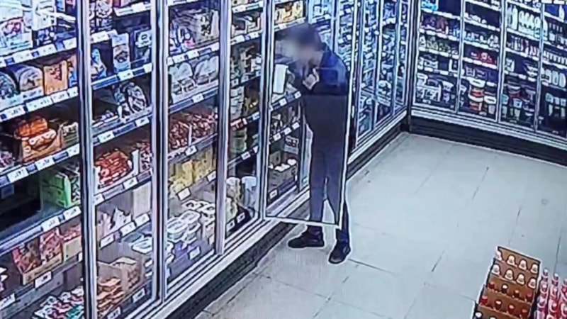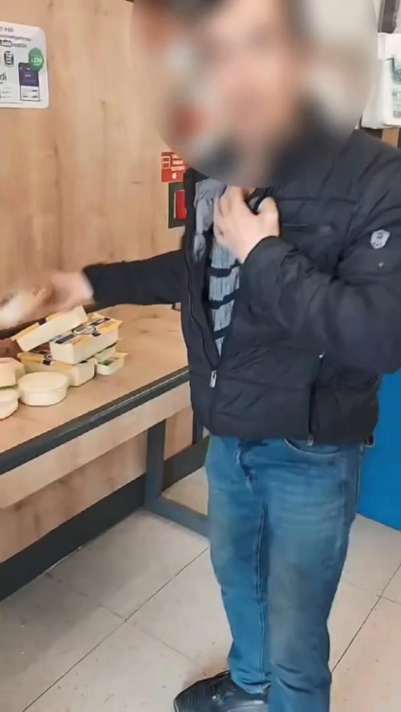 Bir süre sonra dolabı açan şüpheli, raftan birçok tereyağı ve kaşar peynirini kazağının içine soktu.