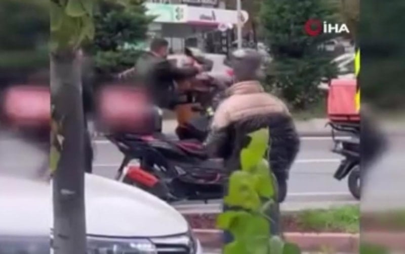Tartışmanın büyümesi üzerine otomobil sürücüsü, aracından inerek motokuryeye saldırdı. O anlar kısa sürede kavgaya dönüştü.