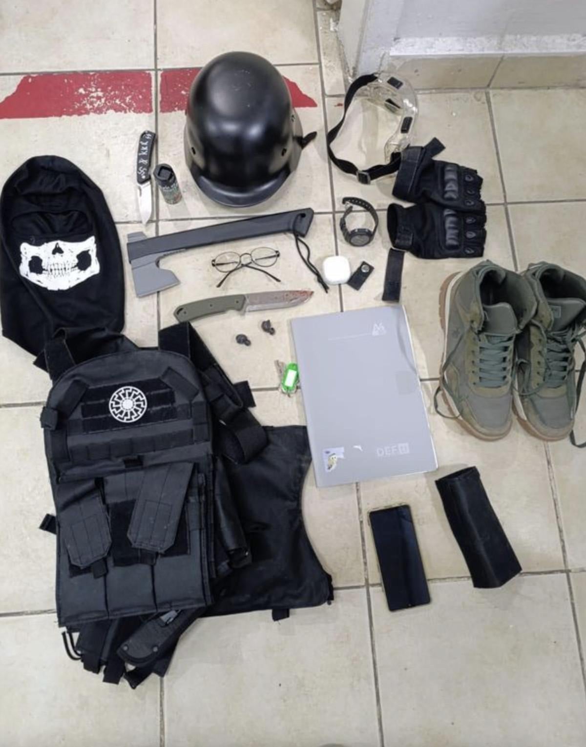 Ben silah ve patlayıcı temin edemediğimden dolayı internet üzerinden balta, bıçak, kask, maske, koruyucu gözlük, hücum yeleği, eldiven, pantolon, palaska aldım. Daha sonradan bu malzemelerin üzerine politik görüşüm olan Nasyonel sosyalizm (Nazizm) görüşüme ait Nazi amblemini yeleğimin üzerine yapıştırdım, yine aynı ideolojime ait 'SS' amblemini, eşittir işareti üzerine çizgi çizerek eşit değildir anlamında bir şekli, KKK (Klu Klux Klan) ibarelerini ve gamalı haç işaretini küçük kamp bıçağımın üzerine beyaz endüstriyel kalemle çizdim.