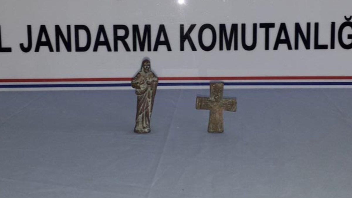 Şüpheli E.Ç. gözaltına alındı, araçta yapılan aramada Helenistik döneme ait olduğu belirtilen bronz Meryem Ana heykeli ile bronz bir haç bulundu.