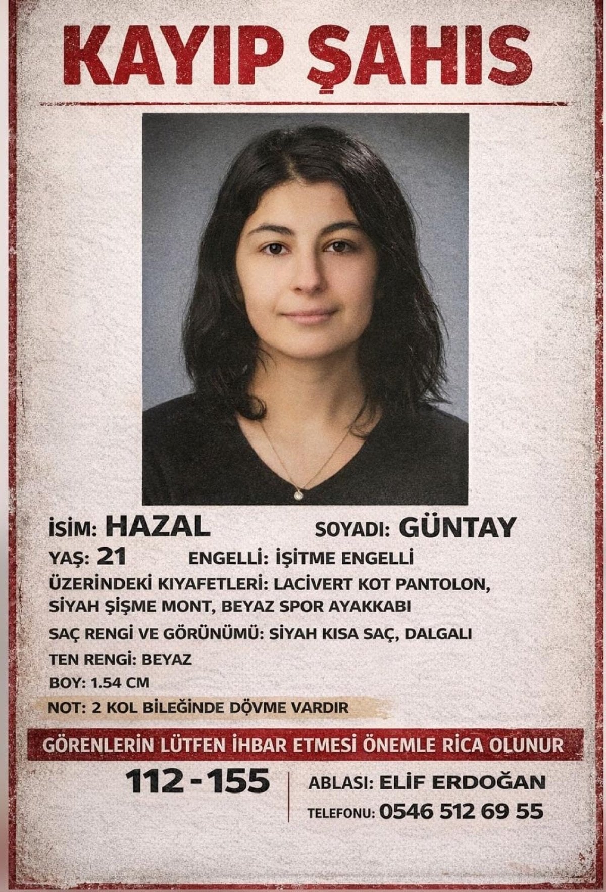 Elif Erdoğan, kız kardeşinin telefonunu yanına aldığını ancak çağrıları cevap vermediğini belirterek, görenlerin polise ihbarda bulunmasını istedi.