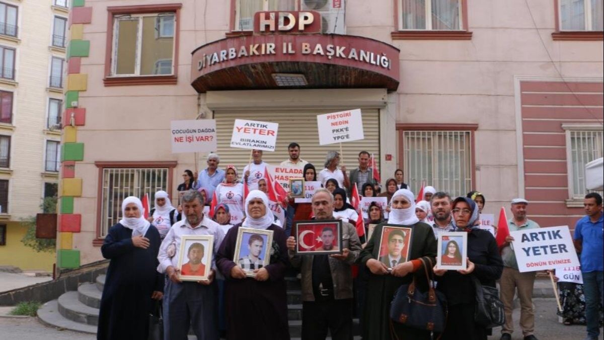 Diyarbakır’da, evlatları PKK tarafından dağa kaçırılan ailelerin, 3 Eylül 2019’da HDP İl Başkanlığı binası önünde başlattıkları oturma eylemi bin 116'ncı gününe girdi.