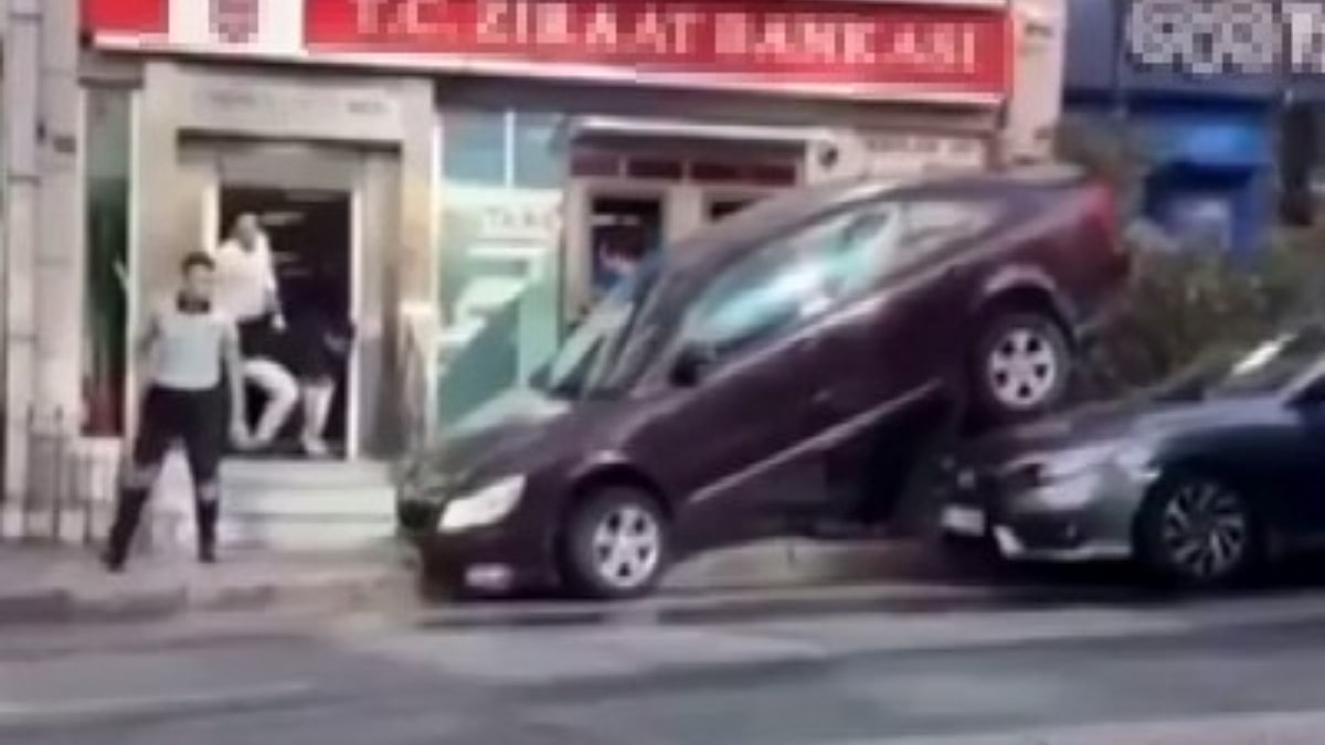 Bir anda gaza yüklenen sürücü, arkasında park halinde bulunan bir başka aracın üzerine çıktı.