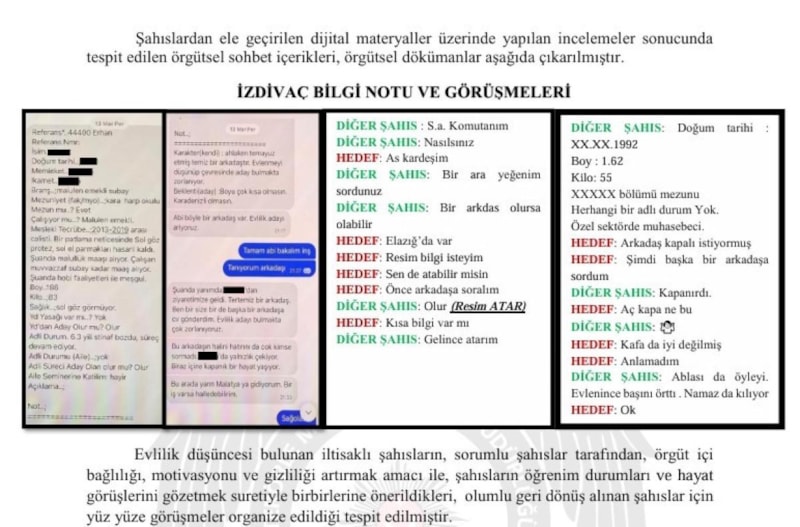İstanbul Emniyet Müdürlüğü'ne bağlı Siber Suçlarla Mücadele ekipleri tarafından deşifresi yapılan içeriklerde, bir istihbarat savaşının izleri ve devletin en derin katmanlarına sızmış örgütün güncel şeması yer alırken, "izdivaç" yapılamasındaki kişilerin yazışmaları, "himmet" adı altında toplanan para trafiği yer alıyor.