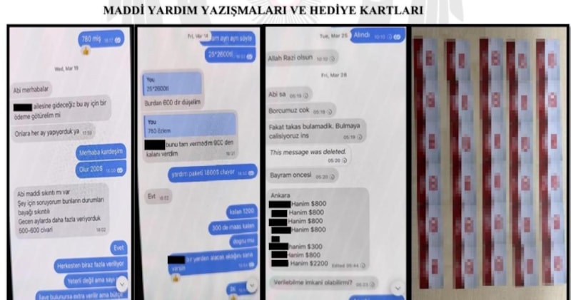 Ayrıca yine örgüt içerisinde sorumlu düzeyde faaliyet yürüten kişilerin, genellikle yurt dışından temin ettikleri paraları, FETÖ/PDY Silahlı Terör Örgütü Üyesi Olmak-Anayasal Düzeni Ortadan Kaldırmaya Teşebbüs suçlarından tutuklu durumda olan TSK'dan ihraç edilmiş eski askeri personellerin eşlerine, aile bireylerine örgütteki çözülmeleri engellemek, örgüt içi motivasyonu artırmak amacı ile maddi destek sağladıkları yazışmalar da gün yüzüne çıktı.