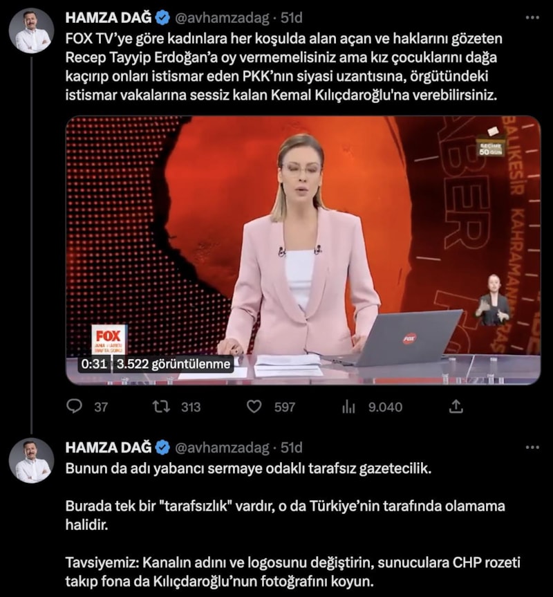 "FOX TV’ye göre kadınlara her koşulda alan açan ve haklarını gözeten Recep Tayyip Erdoğan’a oy vermemelisiniz ama kız çocuklarını dağa kaçırıp onları istismar eden PKK’nın siyasi uzantısına, örgütündeki istismar vakalarına sessiz kalan Kemal Kılıçdaroğlu'na verebilirsiniz.