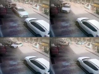 Bir anda hızlanan otomobil, geri geri gelerek park halindeki bagaj kapısı açık olan bir araca çarptı. Hızını alamayan otomobil, kaldırıma çıkıp binanın duvarına çarparak durabildi. Kaldırımda oturan bir genç, aracın kendisine doğru geldiğini fark edince hemen ayağa kalkarak kaçtı.