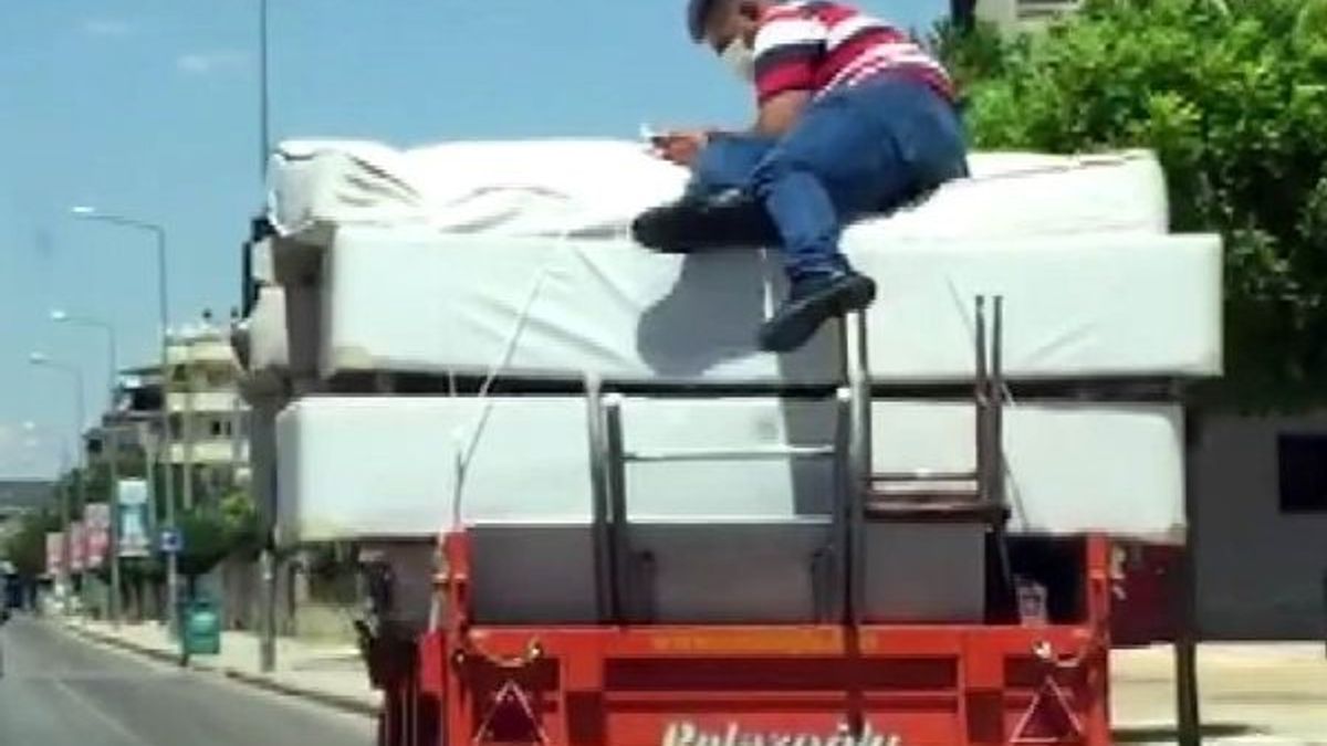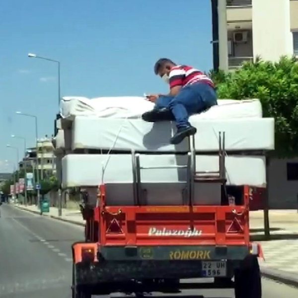 Kentin en işlek caddelerinden Rasafyolu'nda ilerleyen traktörün eşya yüklü römorkunda oturan kişi, tehlikeli şekilde yolculuk etti.