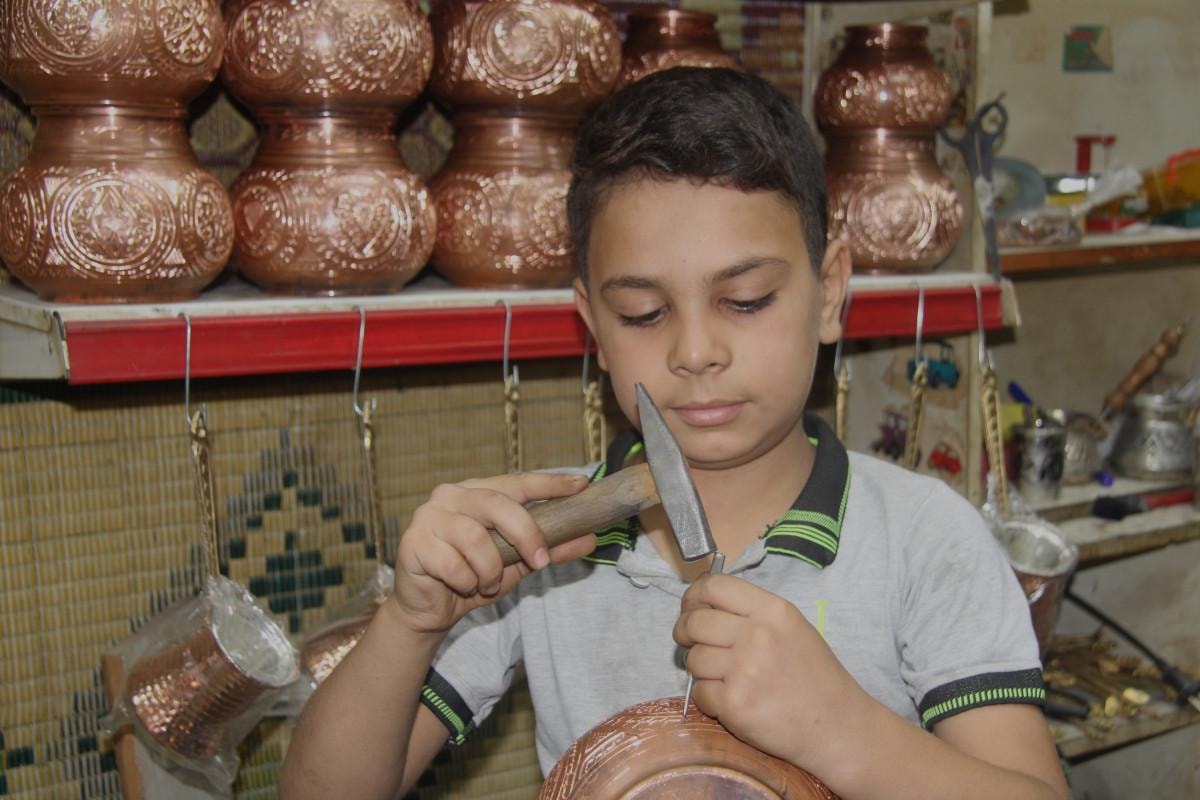 Gaziantep'in Şahinbey ilçesindeki tarihi Bakırcılar Çarşısı'nda bakırcı ustası babası Gökhan Bilici'nin yanında çalışan Yakup Can Bilici, bir ellerinde darbe kalemi, diğerinde de çekiçle ilmek ilmek bakıra şekil veriyor.