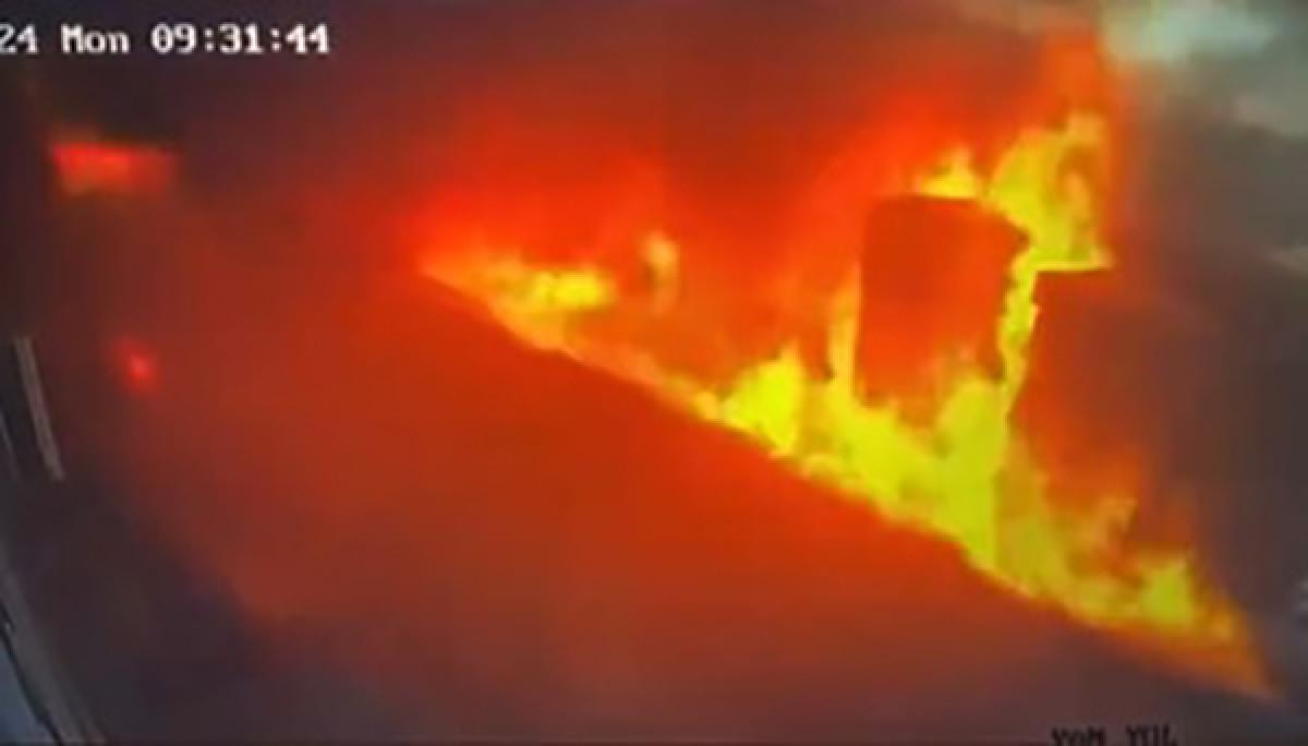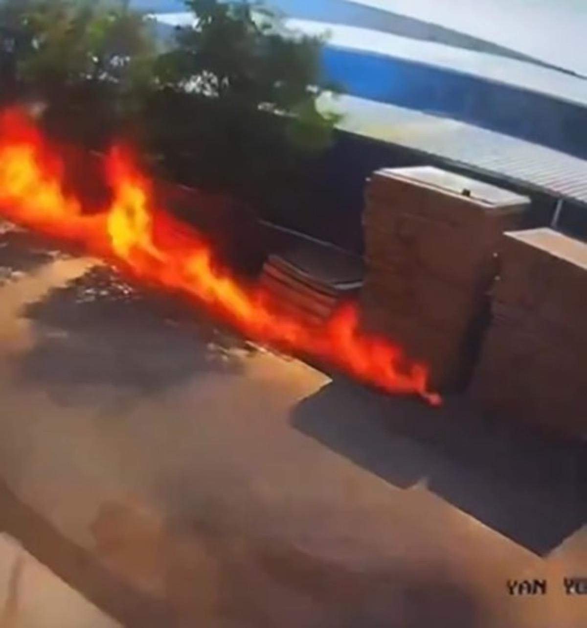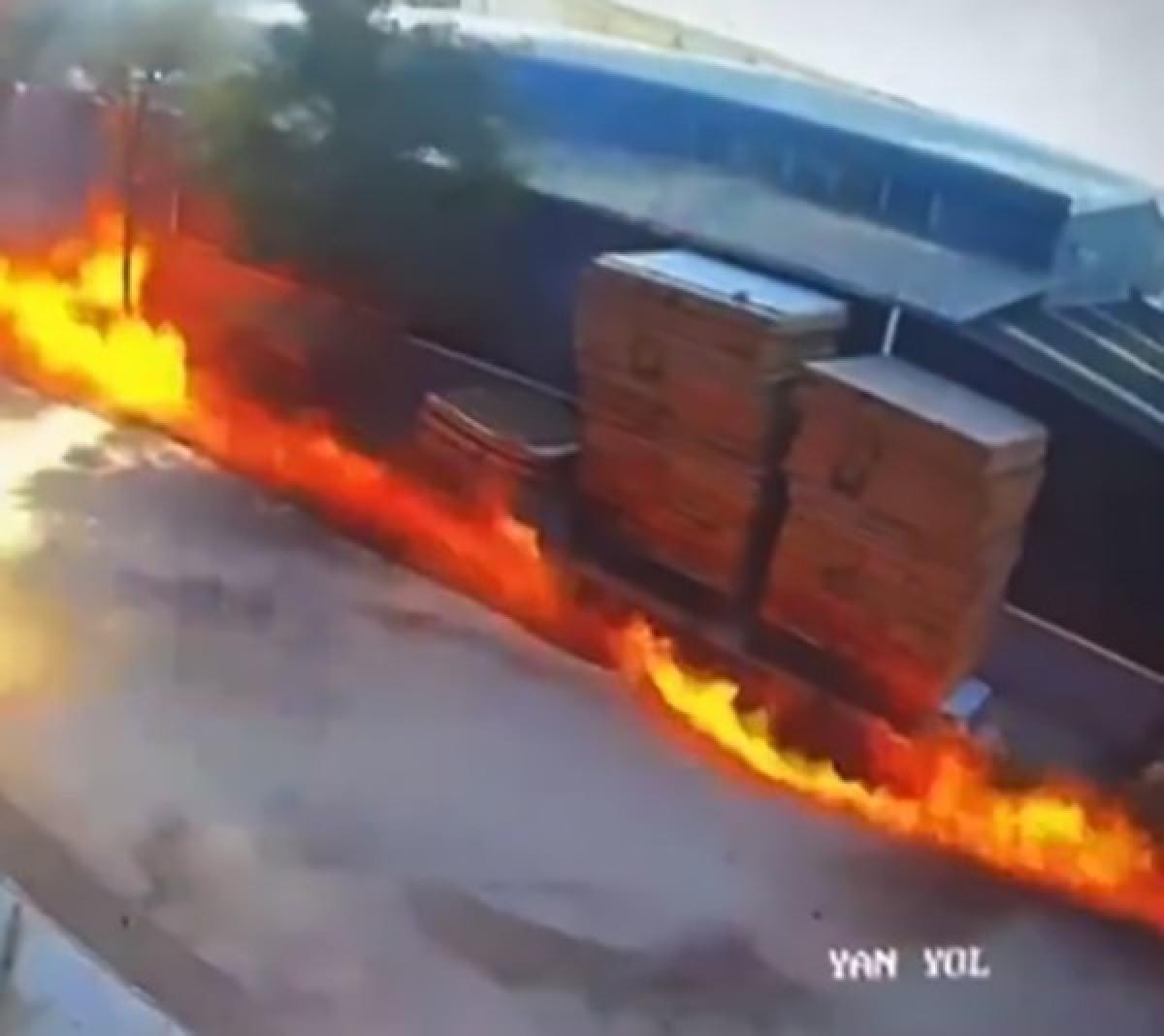 Görüntülerde, itfaiye ekiplerinin yangına müdahale etmeye çalıştığı esnada alev topuna dönen boya ve tinerlerin lav gibi sokağa yayılma anları saniye saniye yer aldı.