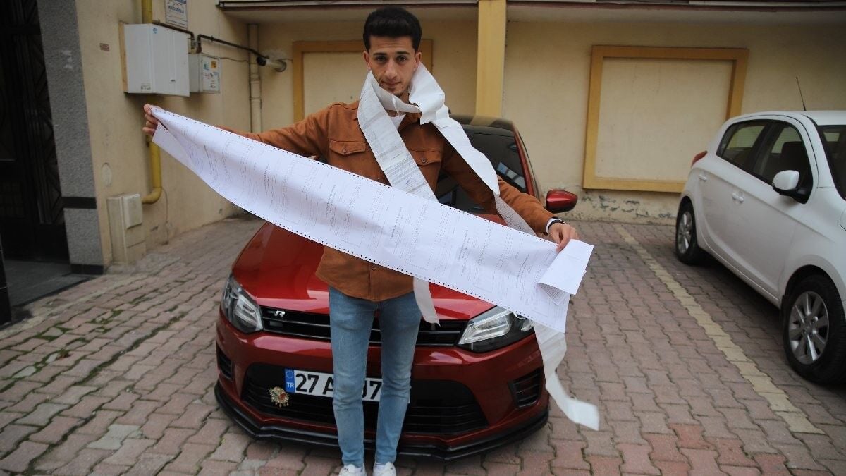 Gelen ceza makbuzlarının uzunluğu boyunun 3 katına ulaştığını belirten Kılıç, ceza makbuzları ile aracına kuşak yaptığını ifade etti.