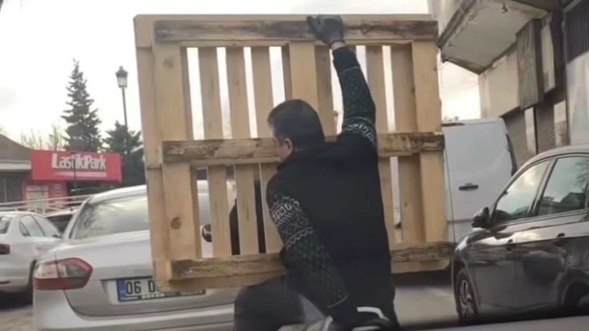 Motosikletin arka kısmında oturan kişinin, yoğun trafikte motosiklet üzerinde tehlikeli şekilde palet taşıdığı anlar cep telefonu kamerasına yansıdı.