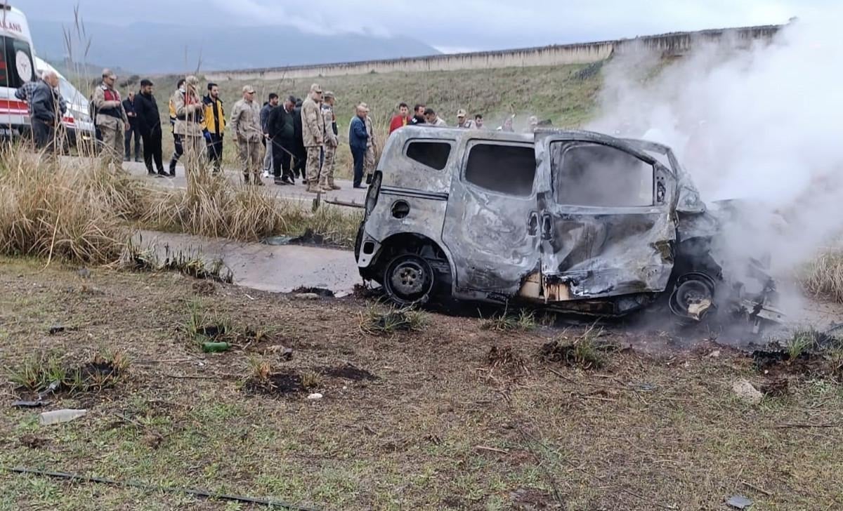Çarpışma sonrası yol kenarına savrulan hafif ticari araç, alev topuna döndü.