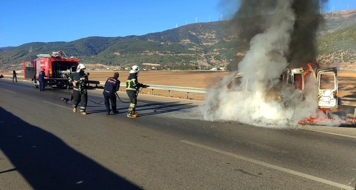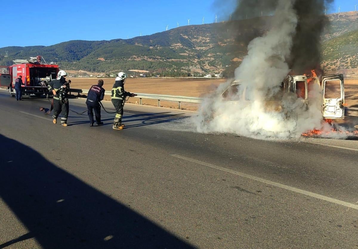 İhbarla gelen itfaiye ekiplerinin müdahalesiyle hafif ticari aracı kaplayan alevler kısa sürede söndürüldü.