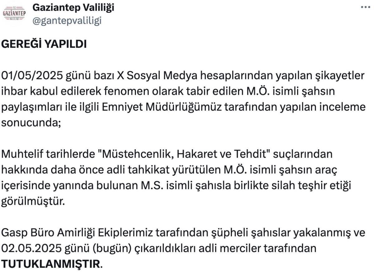 Gaziantep Valiliği'nden yapılan açıklamaya göre, sosyal medya platformu X üzerinden M.Ö. arkadaşı M.S. ile dün silah teşhir ettiği görüntüleri paylaştı.