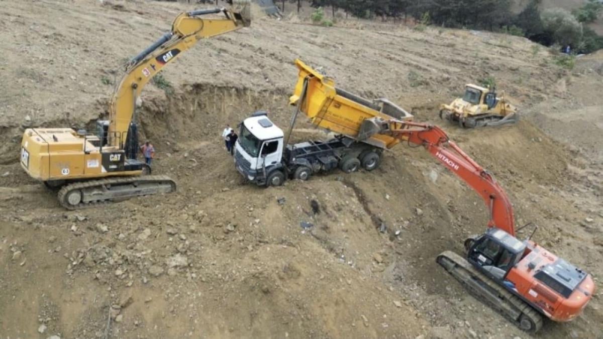 Devrilen kamyonu kurtarmak için şantiyede çalışma başlatıldı. Bölgeye gelen kepçeler, uzun uğraşlar sonucu kamyonu yerinden kaldırmayı başardı. Olay sırasında devrilen kamyon havadan da görüntülendi.