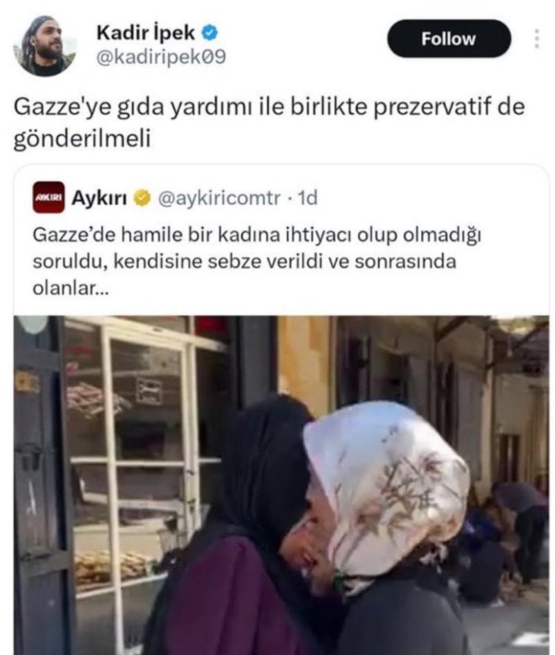 “Kadir İpek” isimli X hesabından, “Gazze’ye gıda yardımı ile birlikte prezervatif de gönderilmeli” şeklinde bir paylaşım yapan İpek hakkında işlem başlatıldı.