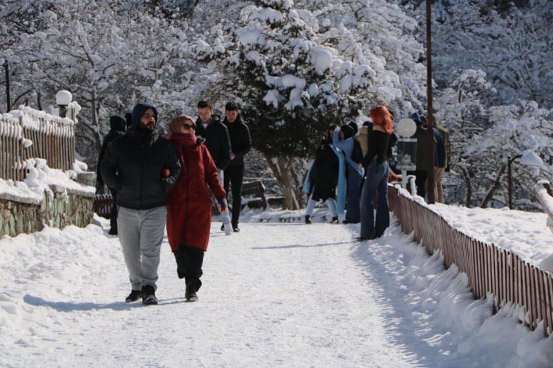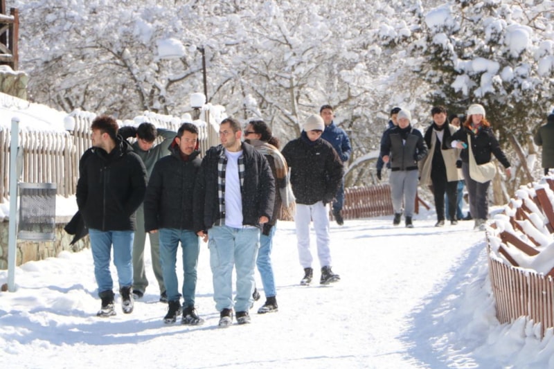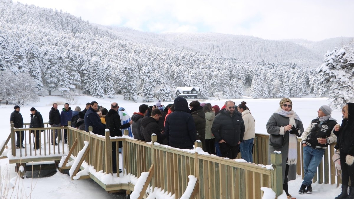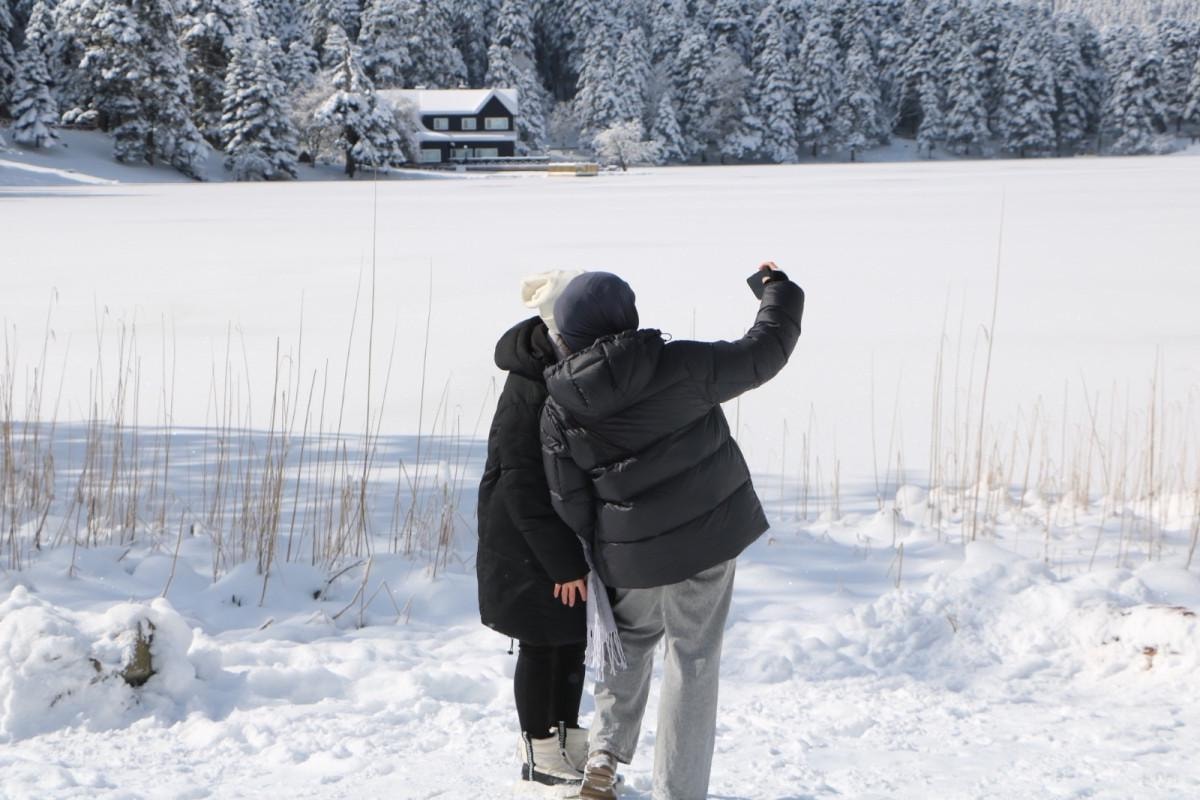Ziyaretçiler, buz tutan gölün etrafında yürüyüş yaptı ve fotoğraf çektirdi.