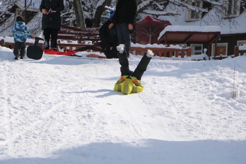Kar kalınlığının 20 santime ulaştığı tabiat parkında çocuklar aileleri ile birlikte kızak kayarak güzel vakit geçirdi.