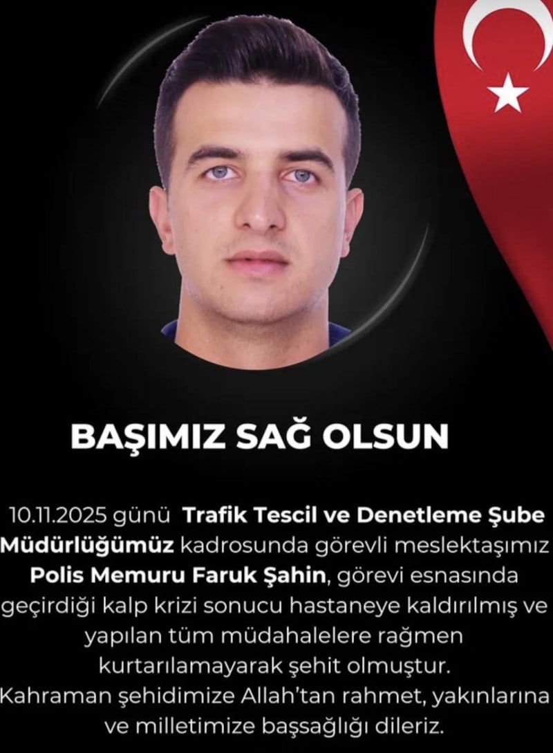 Kent merkezinde görevi başında kalp krizi geçiren 34 yaşındaki polis memuru Faruk Şahin şehit oldu.