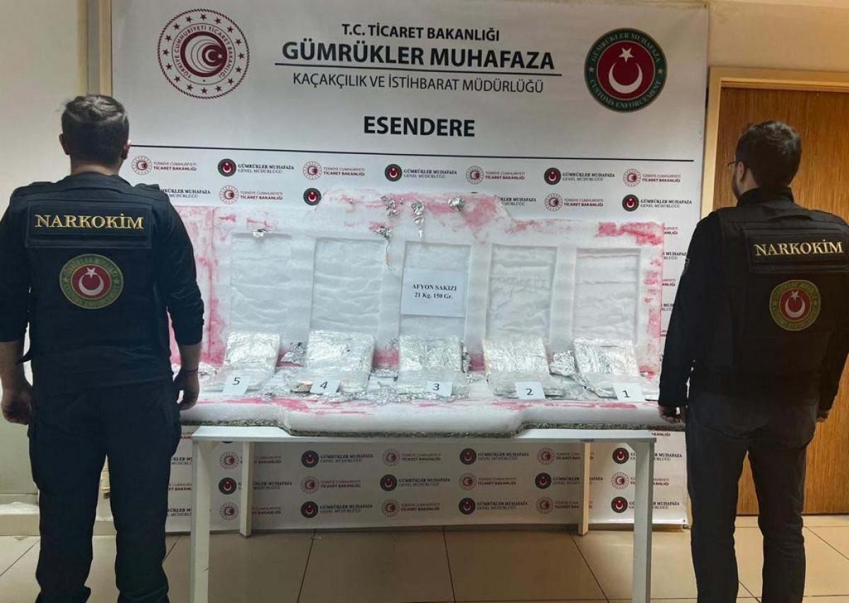 Narkotik dedektör köpeklerin de devreye girdiği aramada şoför kabininde bulunan yatağın içerisine gizlenmiş vaziyette 21 kilo 124 gram afyon sakızı ele geçirildi.