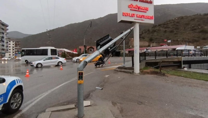 Gümüşhane'de etkili olan fırtınanın şiddetiyle bazı trafik ışıkları yola devrildi.