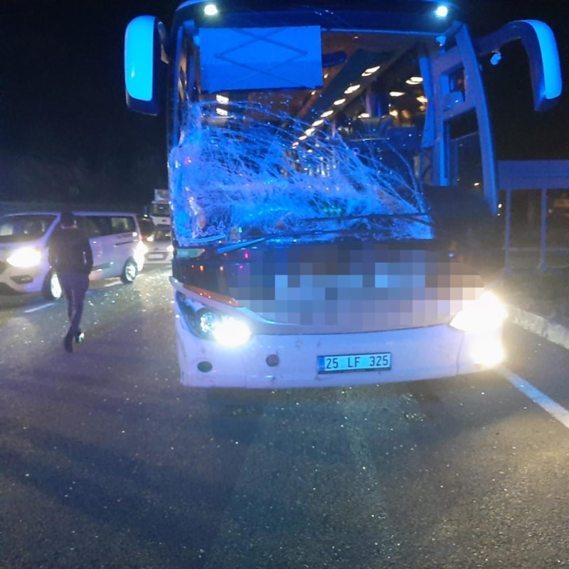 Trafik ekiplerinin çalışmalarının ardından ön camı kırılan otobüsteki yolcular başka bir araca aktarıldı.