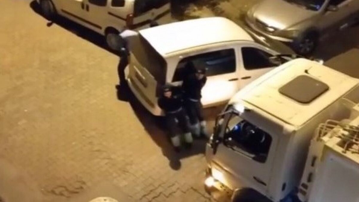 4 kişilik temizlik görevlisi hafif ticari araca yaslandı. Hep birlikte aracı kaldırıp indiren işçiler, bu yöntemle yolu açtı. İşçilerin o anları cep telefonu kamerasına saniye saniye yansıdı.