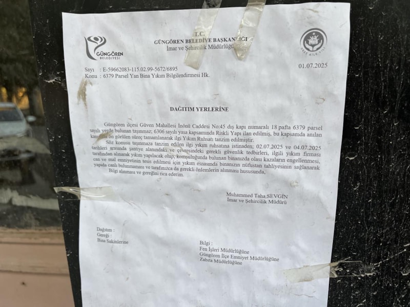 İstanbul Güngören’de yıkım sırasında yan binanın 4. ve 5. kat banyolarında duvar olmadığı fark edildi. Hasar gören bina risk nedeniyle tahliye edildi.