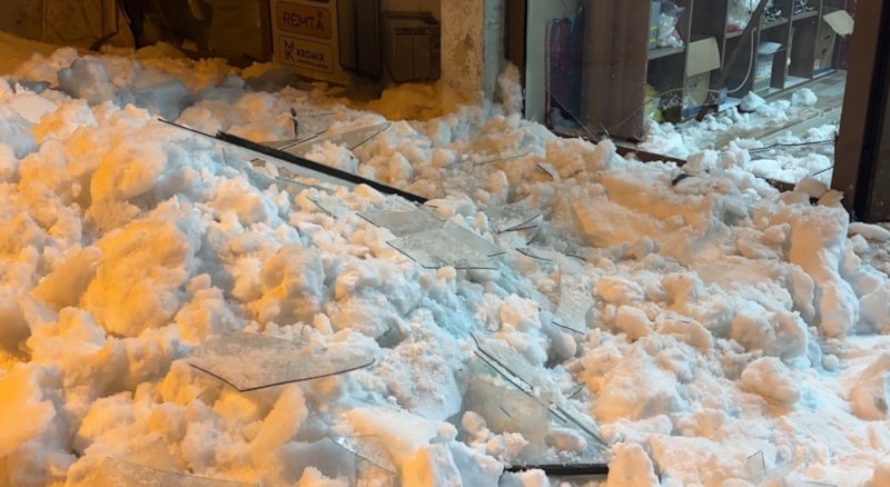Yüksekova ilçesindeki bir binanın çatısından düşen tonlarca ağırlıktaki kar kütlesi, iş yerinin cam ve çerçevelerini yerle bir ederken, o esnada vitrin önünde malzeme yerleştiren işletme sahibi ise ölümden döndü.