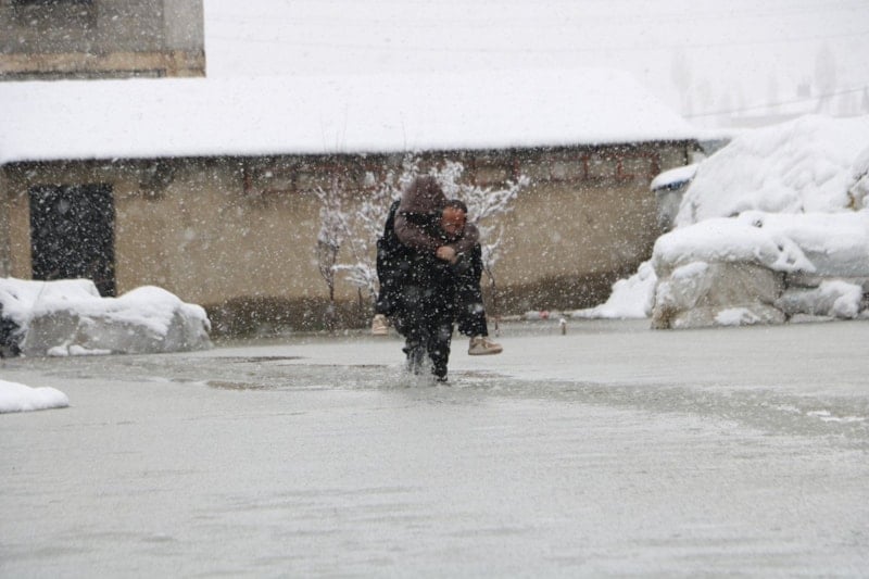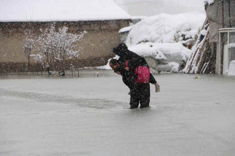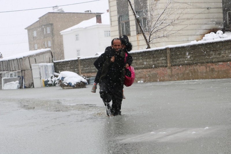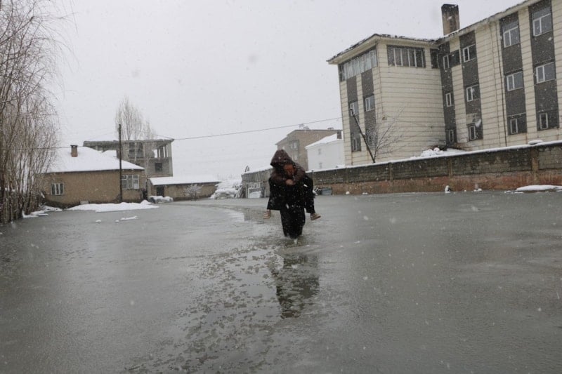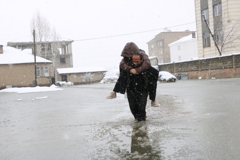 Yüksekova ilçesinde etkili olan yağışlar ve karların erimesi sonucu Yeni Mahalle’de bazı noktalar suyla dolarken, Cengiz Dilce ise evinin önündeki su birikintisi nedeniyle 2 çocuğunu sırtında taşıyor.