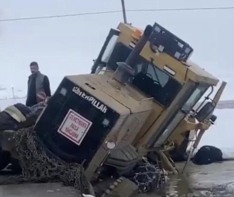 Bugün sabah saatlerinde yol açma çalışmaları için yola çıkan iş makinesi, ilçenin Altınoluk köyü yakınlarında seyir halinde olduğu sırada yol kenarındaki boşluğa düştü.