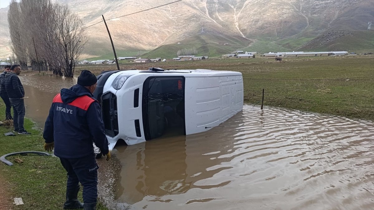 Yağışlı havanın etkisiyle yoldan çıkan minibüs, yol kenarındaki su birikintisine devrildi.