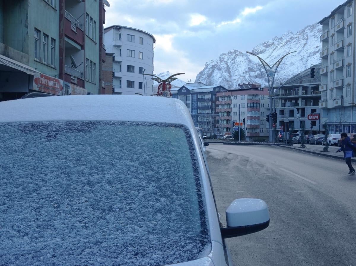 Kentte dağlar beyaza bürünürken gece hava sıcaklığının sıfırın altına düşmesiyle araçların camları da buz tuttu.