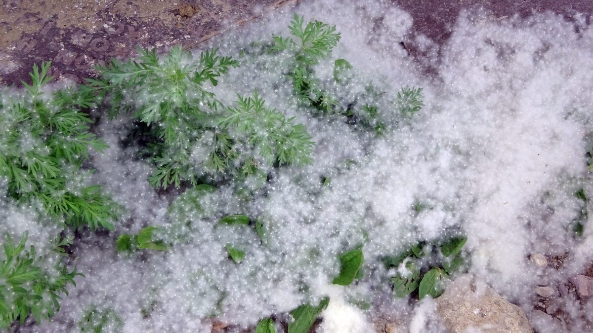 Hakkari'de esen rüzgarla birlikte kavak ağaçlarından düşen ve etrafı beyaza bürüyen polenler sokakları kapladı.
