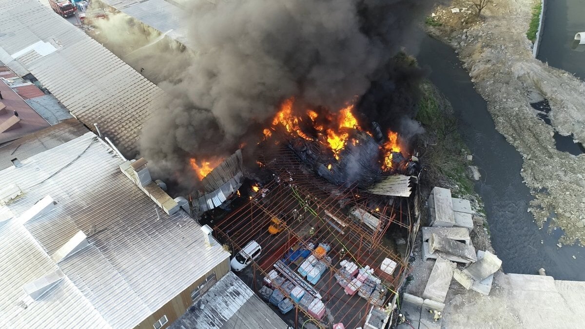 Havadan çekilen görüntülerde, alevlerin prefabriğin büyük bir bölümünü kapladığı görüldü.