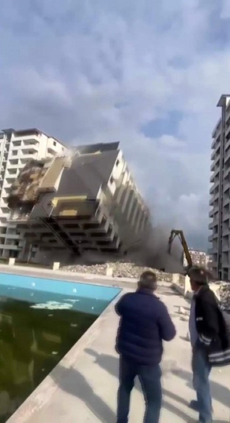 Devasa binanın kontrollü olarak yıkıldığı anlar cep telefonu kamerasıyla saniye saniye görüntülendi.