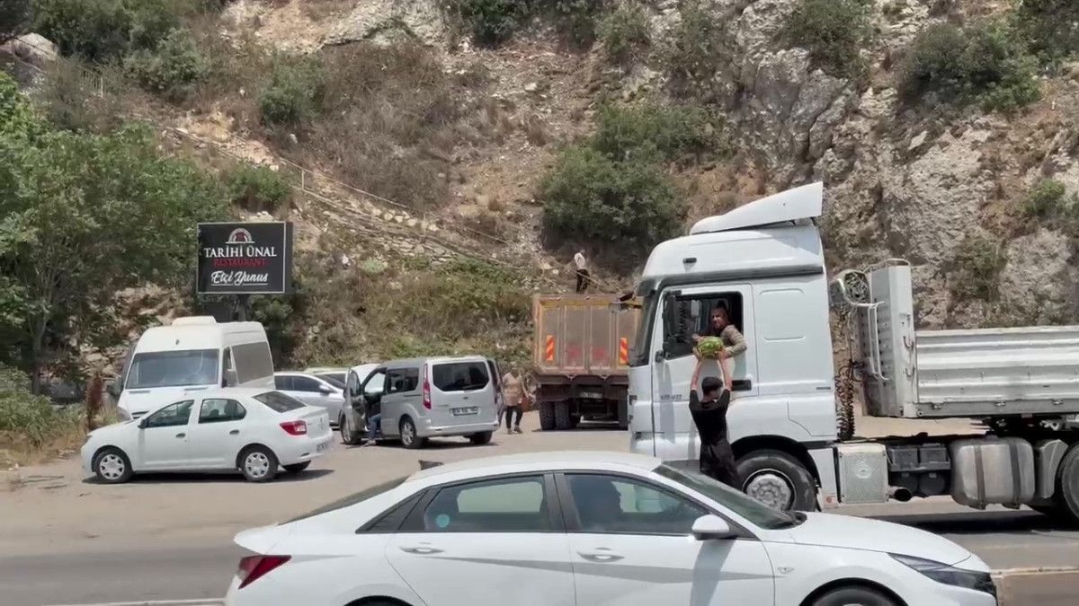 Vatandaşlardan yoğun talep gören kamyon dolusu karpuz, bir saat içinde tükendi.