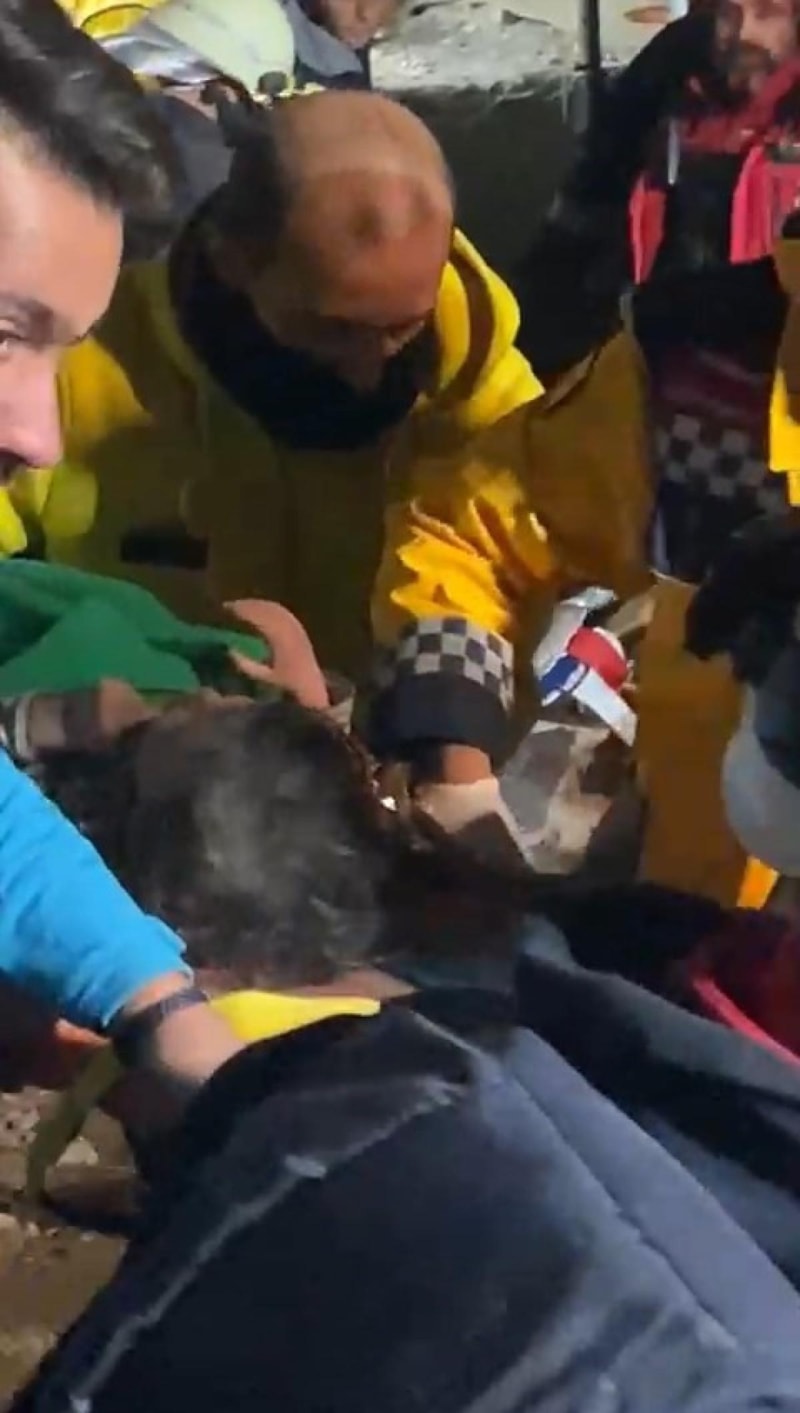 Enkaz altından sağ kurtarılan Sela Elbarazi sağlık ekibine teslim edilirken ekipler sevinç gözyaşı döktü.