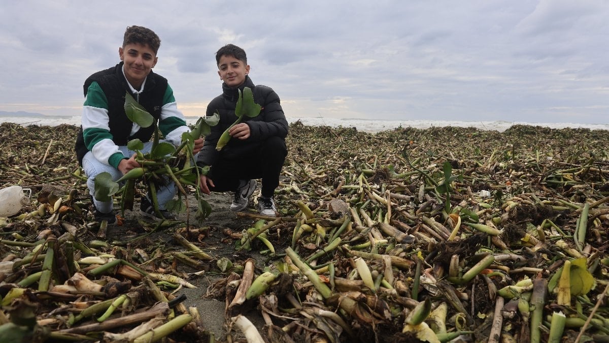 - Güçlü dalgalarla kıyıya taşınan su sümbülleri, Samandağ sahilini yeşile bürüdü.
